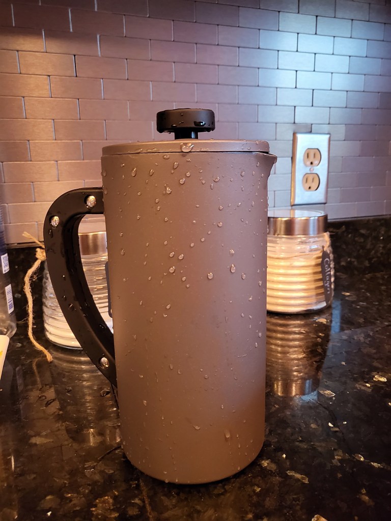 I ran in. Blinders on so as to not see anything else I might suddenly “need”, and went straight to the housewares section. I saw another glass press, and almost left with it, But then…. then my eye caught this beauty. A stainless, double walled insulated, matte black/gray handsome devil. And standing here tea kettle whistling on day 2 of my newest purchase, I smiled. I was internally thankful that my old one bit the dust. This beauty is a true gem that puts a smile on my face even before drinking my coffee!